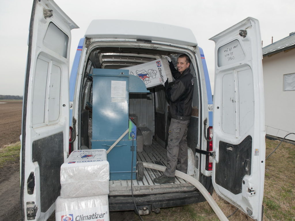 Pak již zbývá příjezd montážní – aplikační firmy, která práci provede. Nákladní automobil stojí spolu s aplikačním strojem před domem a hadicí se izolace dopravuje do připravených prostor. Obvyklá vrstva izolace Climatizer Plus®je od 20 do 30 cm. Izolační schopnosti jsou vynikající.